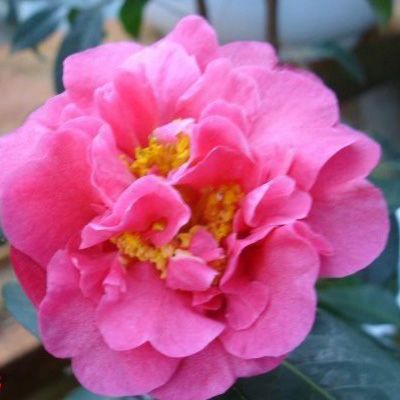 本品为腾冲红花油茶的自然杂交种。花桃红色,托桂型至牡丹重瓣型,中到大型花,花瓣60~100枚不规则松散排列。外部花瓣宽圆波浪状,瓣端具凹缺,瓣面隐约见有脉纹,平展。内部花瓣不规则,直立、高度扭曲,部分雄蕊瓣化,未瓣化雄蕊束状混生于扭曲花瓣间,叶片浓绿色,长椭圆形至卵状椭圆形,先端渐尖至尾尖,基部楔形至钝圆,部分叶缘内折,叶脉下凹叶面呈泡泡状,叶齿浅而细。植株立性,生长旺盛,花期早至中