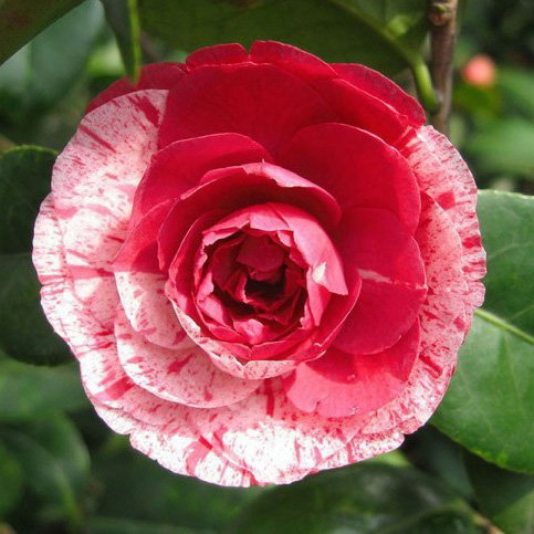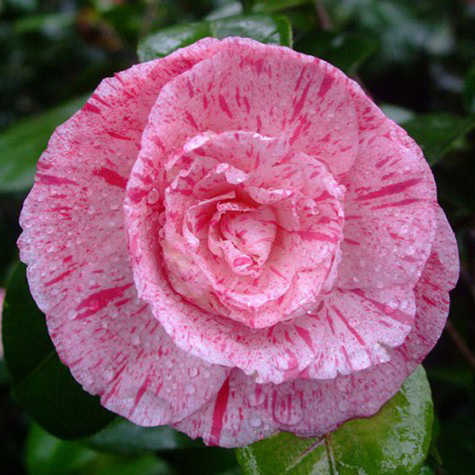 花粉色或粉白色,偶尔开成半红半粉色,花瓣上洒密集红色小斑点和细条纹,完全重瓣型,中到大型花。花瓣倒卵形,瓣端1~2裂微缺,70多枚,8~9轮整齐排列,盛开时花冠呈盆状。外部花瓣盛开时略反卷,中心小花瓣狭长,边缘微扭曲,未完全开放时包裹呈球状。叶片浓绿色,质厚具光泽,部分叶片带黄斑,宽状椭圆形,先端渐尖或短尖,基部宽楔形至钝圆,叶面粗糙,叶脉下凹,叶齿浅而稀,植株紧凑,生长旺盛,花期中至晚